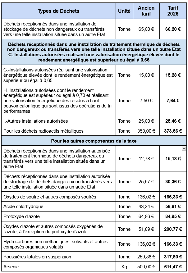 Tarifs TGAP 2026
